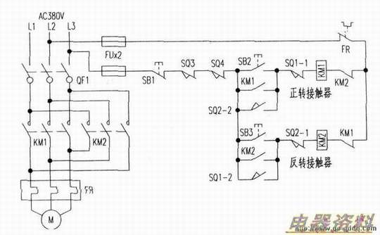 下图是自动往返循环控制其电路工作原理:当按下反转启动按钮SB3后反转接触器KM2得电吸合,电机运转。此时通过机械传动装置拖动工作台向右移动。当移到挡铁碰触到SQ2(固定在床身上)时,串联在KM2线圈的SQ2-1常闭点断开,反转接触器KM2线圈断电释放。与此同时,行程开关SQ2—2常开点闭合。因其与正转按钮SB2并联,接通了正转线圈KM1电路,使之得电吸合,电动机转为正转,工作台转换为向左移动。当工作台向左移动碰触挡铁时,又转换为向右移动。如此往返。