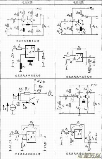 方法:瞬时极性法。反馈信号与输入信号接相同点,极性相同为正反馈,极性相反为负反馈;反馈信号与输入信号接不同点,极性相同为负反馈,极性相反为正反馈。见上表.反馈与反馈的典型举例见下表。