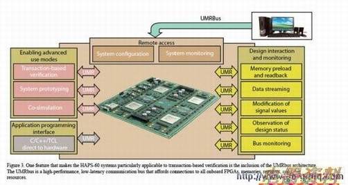 包含UMRbus架构使得HAPS-60系统尤其适用于基于事务的验证(图3)。UMRbus是一种高性能、低延时通信总线,它能为所有板载FPGA、 、寄存器和其它资源提供连接。