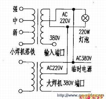 一建筑工地十层大楼地下室作业中突然停电,顿时地下室一片漆黑,工地临时距离总有近千米,两台电焊机的电源线都不够长,差得太多,这时想将两台电焊机的电源线合二为一,采用“接力”办法与电源插座线、照明灯线拼接以应急。电源被引到工作面,可是问题出现了,工作面需要380V给大电焊机,220V给小电焊机和照明,由于电源线是用两芯和三芯拼接,不能满足同时传输两电焊机的输入端(都有380V和220V两组输入),经仔细观察发现:初级都采用抽头,分两组端口,原理图如附图所示。随即将AC380V直接于大焊机380V端口,并从其220V端口引一组电压给小电焊机220V端口,同时供给220V照明灯泡,这样只用一组临时电源线,不但大、小电焊机都可工作,同时也解决了照明问题。