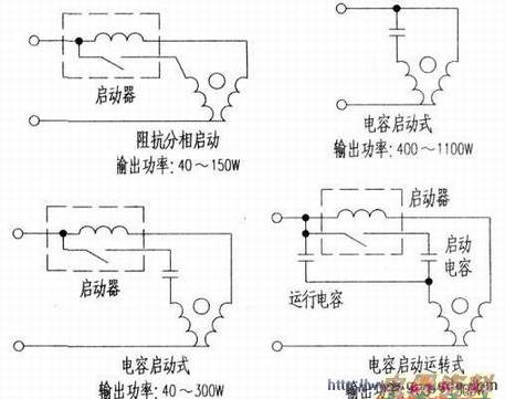 如左上图所示。这种启动方式是刚开始通电时。利用启动器(、、离心开关等)使启动绕组和运行绕组同肘受电。待启动完成之后,断开启动绕组,只靠运行绕组来继续运行。该方式结构简单,启动转矩小、启动电流大,常用于电冰箱及小型陈列柜。