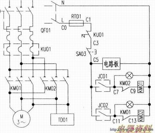 下图中。时间继电器用来调整电机自由停车时间。当停止时,正转接触器KM01断开,相应时间继电器Kt01也断开(要选用断电延时型的时间继电器。如JS14A—D)。这时,如再揿反转启动按钮。因为时间继电器Kt01的触点没有闭合。所以揿反转启动按钮不起作用。同理,要再回到正转状态,先揿停止按钮SA03,等待信号指示灯LD1亮时。揿正转启动按钮,正转接触器KM01闭合,电机才能正转启动运行。