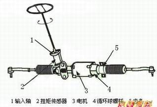 扭杆式扭矩传感器主要由扭杆弹簧、转角-位移变换器、电位计组成。扭杆弹簧主要作用是检测司机作用在方向盘上的扭矩,并将其转化成相应的转角值。转角-位移变换器是一对螺旋机构,将扭杆弹簧两端的相对转角转化为滑动套的轴向位移,由刚球、螺旋槽和滑块组成。滑块相对于输入轴可以在螺旋方向上移动,同时滑块通过一个销安装到输出轴上,可以相对于输出轴在垂直方向上移动。因此,当输入轴相对于输出轴转动时,滑块按照输入轴的旋转方向和相对于输出轴的旋转量,垂直移动。当转动方向盘的时候,钮矩被传递到扭力杆,输入轴相对于输出轴方向出现偏差。该偏差是滑块出现移动,这些轴方向的移动转化为电位计的杠杆旋转角度,滑动触点在线上的移动使电位计的值随之变化,电阻的变化通过电位计转化为。这样扭矩信号就转化为了电压信号。
