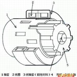 如图4所示为非接触式扭矩传感器的典型结构。输入轴和输出轴由扭杆连接起来,输入轴上有花键,输出轴上有键槽。当扭杆受方向盘的转动力矩作用发生扭转时,输入轴上的花键和输出轴上键槽之间的相对位置就被改变了。花键和键槽的相对位移改变量等于扭转杆的扭转量,使得花键上的磁感强度改变,磁感强度的变化,通过线圈转化为电压信号。信号的高频部分由检测电路,仅有扭矩信号部分被放大。非接触扭矩传感器由于采用的是非接触的工作方式,因而寿命长、可靠性高,不易受到磨损、有更小的延时、受轴的偏转和轴向偏移的影响更小,现在已经广泛用于轿车和轻型车中,是EPS传感器的主流产品。