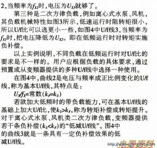 一些负载在高低转速时阻转矩变化明显,例如离心浇铸机。其转矩特性如图2所示。电机在低频运行时不需要太大的转矩,U/f比可以选小一些,如图4中U/f线。
