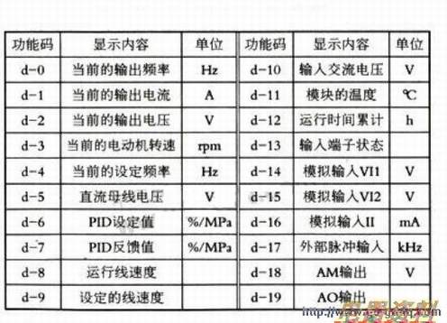 博世力士乐CVF-G3系列变频器通过屏显示的状态监控参数见下表。由参数L-71、L-51和L-52选择显示的具体内容。其中L-71选择初上电时显示的内容。以及运行时第一个希望显示的内容:L-51和L-52分别选择运行时第二个及第三个希望显示的内容。例如,将L-71设定为0(d-0),L-51设定为1(d-1),L-52设定为2(d-2),那么,初上电时显示的输出为0,开始运行后显示的是实际输出频率;按压面板上的“SHIFT”键可循环显示当前的输出频率、输出和输出。尽管可选择显示的监控参数如表1所示多达20个,但能方便地切换显示的参数只有3个。你要选择3个对运行安全至关重要的参数或你较关心的参数进行设置。运行中若欲查看其他运行参数,可通过重新设定上述3个参数码的方法来实现。变频器的这种功能规范是为了使运行人员能方便快捷地查阅电动机最重要的运行参数。
