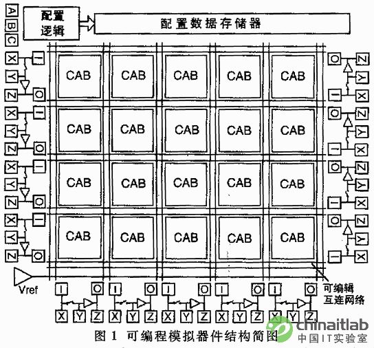 模拟I/O单元等与器件引脚相连,负责对输入、输出信号进行驱动和偏置、配置逻辑通过串行、并行总线或在系统编程(ISP)方式,接收外部输入的配置数据并存入配置数据 存储 器;配置数据可以是移位寄存器、SRAM或者非易失的E2PROM、FLASH等,其容量可以数十位至数千位不等;可编程互连网络是多输入、多输出的信号 交换 网络,受配置数据控制,完成各CAB之间及其与模拟I/O单元之间的电路连接和信号传递;CAB是可编程模拟器件的基本单元,一般由运行放大器或跨导放大器配合外围的可编程阵列、阵列、开关阵列等共同构成。各元件取值及相互间连接关系等均受配置数据控制,从而呈现不同的CAB功能组态和元件参数组合,以实现用户所需的电路功能。CAB的性能及其功能组态和参数相合的数目,是决定可编程模拟器件功能强弱和应用范围的主要因素。