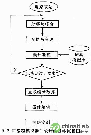 可编程模拟器件开发的主要步骤依次为:(1)电路表达,即根据设计任务,结合所选用的可编程模拟器件的资源、结构特点,初步确定设计方案;(2)分解与综合,即对各功能模块进行细化,并利用开发工具输入或调用宏函数自动生成电原理图;(3)布局布线,即确定各电路要素与器件资源之间的对应关系以及器件内部的信号连接等。可自动或手动完成;(4)设计验证,即对设计进行仿真(根据器件模型和输入信号等,计算并显示电路响应),以初步确定当前设计是否满足功能和指标要求。如果不满足,应返回上一步骤进行修改;(5)由开发工具自动生成当前设计的编程数据和文件;(6)器件编程,即将编程数据写入器件内部的配置数据存储顺。一般通过在线配置方式完成,也可利用通用编程器脱机编程;(7)电路实测,即利用仪器对配置后的器件及电路进行实际 测试 ,详细验证其各项功能和指标。如果发现问题,还需返回前有关步骤加以修改和完善。可编缉模拟器件设计的基本流程图如图2所示。
