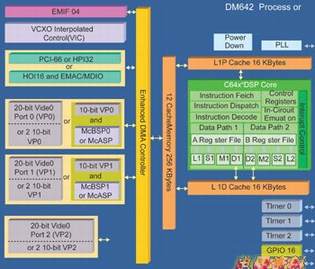 由图中可以看出,DM642片上包含了如下接口: 三个可配置的视频接口,可以和