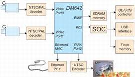 DM642的这些功能,使得它非常合适作为多媒体硬件平台,基于它的各种应用系统已经出现或正在开发中,图2中,可以看到一个基于DM642的网络视频监控终端的设计例子。