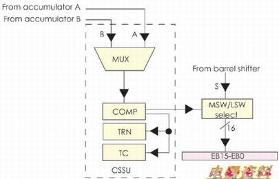 图7 比较、选择与保存单元(CSSU)功能框图 乘/加模块:由乘法器、加法器、输入数据的符号控制逻辑、小数控制逻辑、零检测、舍入、溢出/饱和逻辑和16位暂存寄存器T等组成。乘法器和ALU在一个指令周期内共同完成(17 17补码)乘/加(40位)运算,且可并行地作ALU运算,这些功能可用来做Euclidean距离及LMS等复杂运算。乘/加模块功能方框图如图6所示。 比较、选择与保存单元(CSSU):可以完成累加器的高位字和低位字之间的最大值比较(CMPS指令)。另一功能是利用优化的片内硬件资源完成数据通信、模式识别等领域中经常用到的Viterbi蝶形运算。