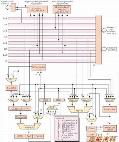 总线结构 一组程序总线(PAB、PB)和三组数据总线CAB、CB,DAB、DB,EAB、EB)将内部各部件联系起来。