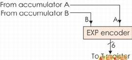 图8 指数编码器 指数编码器:用于支持单周期指令EXP的专用硬件,如图8所示。 累加器中数值的指数值,以二进制补码形式(-8~31)存放于暂存器T中;