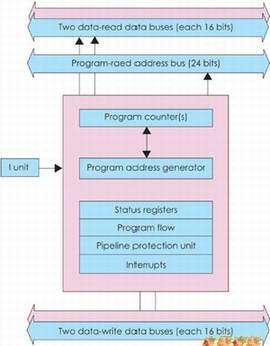 图3 程序流单元(P单元)框图 四个40-bit 累加器:保持计算结果和减少所需存储器数量。 十二条独立总线:并行地对不同操作单元同时提供处理指令和操作数。