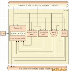 图2 指令缓冲单元(1单元)框图 一个32×16-bit 指令缓冲队列:缓冲可变长度指令和实现块重复操作。 两个17-bit×17-bit MAC:在单周期内实现双MAC操作。 一个40-bit ALU:执行高精度算术和逻辑运算。 一个40-bit 桶形移位寄存器:可以把40-bit结果左移31 位或右移32位。 一个16-bit ALU:和主ALU并行执行简单算术运算。