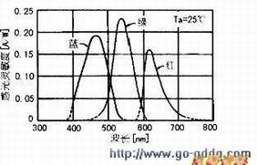 在S9032—02芯片上集成了对红(λP=620nm)、绿(λP=540nm】、蓝(λp=460nm)有高灵敏度的三只。用撼除近红外光。从而得纯正的色信号,其分光灵敏度特性见右图,传感器的内部结构见上图.