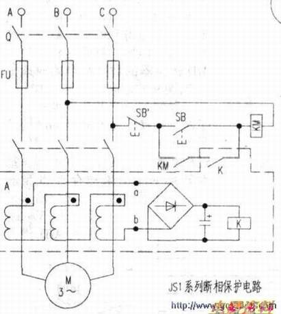 JS1系列电动机断相保护器是一种结构简单,性能较好,价格较低的三桕电动机断相保护装置。保护原理及的组成如下图所示。