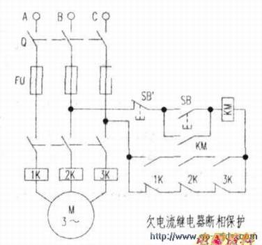 将三个欠电流继电器分别串接在电机三相主电路中,阵将三个继电器的一副常开触头串联。常闭触点串联后再并联在控制电路中。如下图所示。电机正常运行时。欠电流继电器的常闭触点闭合。当发生断相运行时,一相电流消失。该相继电器动作。其常闭触点断开切断控制回路。接触器主触点断开。从而切断电机主电路保护电机。