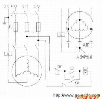 对于三角形接法的电机,可以利用接成星形的器接在三角形绕组上。引出人为的中性点(如下图-b所示)。的容最以2—4μF为宜。由于实际电路的中性点对地有几伏电压。困此一般将继电器的动作电压定在12—24v。