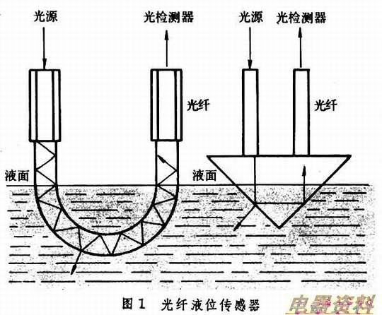 ① 传光型光纤传感器 以多模光导纤维来传输光信号,根据光接受强度不同进行测量,而对被测参数起检测作用的是其他敏感元件。这种传感器多用于工业检测液位、压力、形变、温度、流速、电流、磁场等。它的优点是性能稳定可靠,结构简单,造价低廉,缺点是灵敏度低。图1[ 光纤液位传感器]为光纤液位传感器的原理示意图。