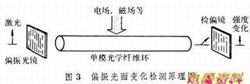 ③ 偏振调制型光纤传感器 单模光导纤维的偏振特性极易受到外界各种物理量的影响,如在高电场下的克尔效应和在强磁场下的法拉第效应,利用这一原理可制成大电流、高测试传感器(图3[ 偏振光面变化检测原理图])