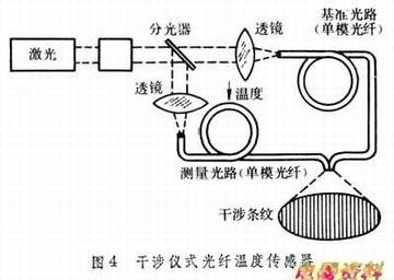 ④ 相位调制型光纤传感器 用单模光导纤维构成干涉仪,外界各种物理量的影响因素能导致光导纤维中光程的变化,从而引起干涉条纹的变动。图4[ 干涉仪式光纤温度传感器]