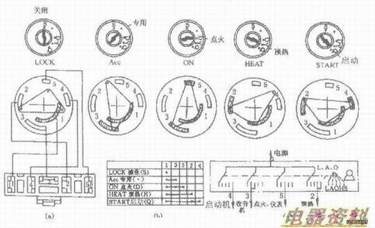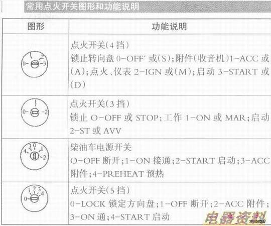 各厂家生产的点火开关不完全一样。常用点火开关的图形和功能说明见下表。