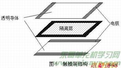 典型触摸屏的工作部分一般由三部分组成,如图1所示:两层透明的阻性导体层、两层导体之间的隔离层、电极。阻性导体层选用阻性材料,如铟锡氧化物(ITO)涂在衬底上构成,上层衬底用塑料,下层衬底用玻璃。隔离层为粘性绝缘液体材料,如聚脂薄膜。电极选用导电性能极好的材料(如银粉墨)构成,其导电性能大约为ITO的1000倍。