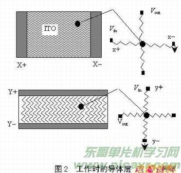 触摸屏工作时,上下导体层相当于网络,如图2所示。当某一层电极加上时,会在该网络上形成电压梯度。如有外力使得上下两层在某一点接触,则在电极未加电压的另一层可以测得接触点处的电压,从而知道接触点处的坐标。比如,在顶层的电极(X+,X-)上加上电压,则在顶层导体层上形成电压梯度,当有外力使得上下两层在某一点接触,在底层就可以测得接触点处的电压,再根据该电压与电极(X+)之间的距离关系,知道该处的X坐标。然后,将电压切换到底层电极(Y+,Y-)上,并在顶层测量接触点处的电压,从而知道Y坐标。