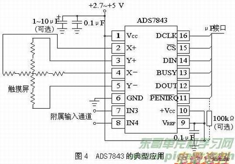 V~+V,转换电压的输入范围为0~ VREF,最高为125 k。ADS7843的引脚配置如图3所示。表1为引脚功能说明,图4为典型应用。