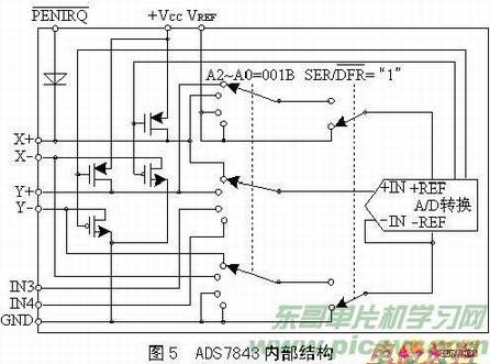ADS7843之所以能实现对触摸屏的控制,是因为其内部结构很容易实现电极电压的切换,并能进行快速A/D转换。图5所示为其内部结构,A2~A0和SER/为控制寄存器中的控制位,用来进行开关切换和参考电压的选择。