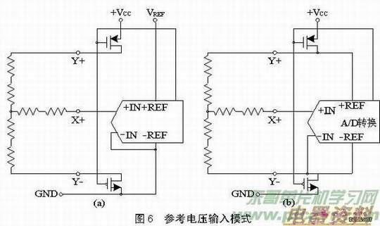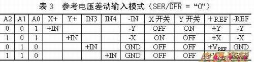 ADS7843支持两种参考电压输入模式:一种是参考电压固定为VREF,另一种采取差动模式,参考电压来自驱动电极。这两种模式分别如图6(a)、(b)所示。采用图6(b)的差动模式可以消除开关导通压降带来的影响。表2和表3为两种参考电压输入模式所对应的内部开关状况。
