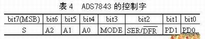 ADS7843的控制字如表4所列,其中S为数据传输起始标志位,该位必为"1"。A2~A0进行通道选择(见表2和3)。