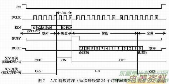 ADS7843的典型应用如图4所示。假设μP接口与51的P1.3~P1.7相连,现以一次转换需24个时钟周期为例,介绍A/D转换时序的程序设计。