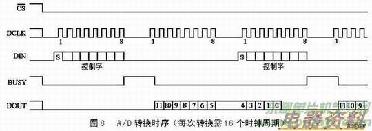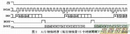 为了完成一次电极电压切换和A/D转换,需要先通过串口往ADS7843发送控制字,转换完成后再通过串口读出电压转换值。标准的一次转换需要24个时钟,如图7所示。由于串口支持双向同时进行传送,并且在一次读数与下一次发控制字之间可以重叠,所以转换速率可以提高到每次16个时钟周期,如图8所示。如果条件允许,CPU可以产生15个CLK的话(比如s和ASs),转换速率还可以提高到每次15个时钟周期,如图9所示。