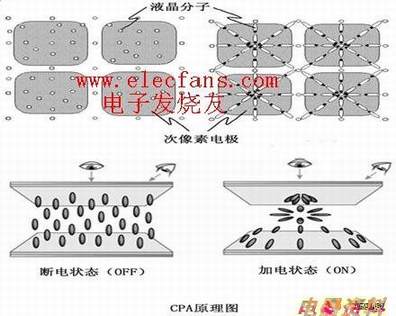 CPA (Continuous wheel Alignment,连续焰火状排列) 模式广视角技术严格来说也属於VA阵营的一员。在未加电状态下,液晶分子跟VA模式一惯特性一样都是分子长轴垂直於面板方向互相平行排列。如图,CPA模式的每个图元都具有多个方形圆角的次图元电极,当加到液晶层次图元电极和另一面的电极上时,形成一个对角的电场驱使液晶向中心电极方向倾斜。各液晶分子朝着中心电极呈放射的焰火状排列。由於图元电极上的电场是连续变化的,所以这种广视角模式被称作"连续焰火状排列(CPA)"模式。