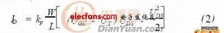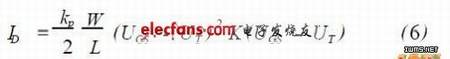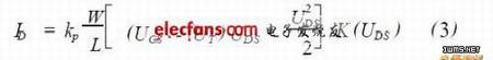 其中ID 为漏极电流, kp 为跨导系数,W 为沟道宽度, L 为沟道长度, UT 为阈值电压, UGS和UDS分别是栅极电压和漏极电压。