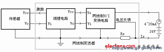 两线制变送器的原理是利用了4~20mA信号为自身提供电能。如果变送器自身耗电大于4mA,那么将不可能输出下限4mA值。因此一般要求两线制变送器自身耗电(包括在内的全部)不大于3.5mA。这是两线制变送器的设计根本原则之一。 从整体结构上来看,两线制变送器由三大部分组成:传感器、调理电路、两线制V/I变换器构成。传感器将温度、压力等物理量转化为电参量,调理电路将传感器输出的微弱或非线性的电信号进行放大、调理、转化为线性的输出。两线制V/I变换电路根据信号调理电路的输出控制总体耗电;同时从环路上获得电压并稳压,供调理电路和传感器使用。 除了V/I变换电路之外,电路中每个部分都有其自身的耗电电流,两线制变送器的核心设计思想是将所有的电流都包括在V/I变换的反馈环路内。如图,采样Rs串联在电路的低端,所有的电流都将通过Rs流回到负极。从Rs上取到的反馈信号,包含了所有电路的耗电。在两线制变送器中,所有的电路总功耗不能大于3.5mA,因此电路的低功耗成为主要的设计难点。