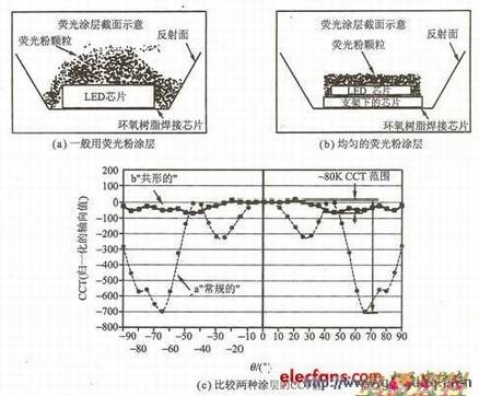 M.R.Kramas等人发现,如果将荧光粉随意放在LED芯片上,如下图(a)所示发光均匀性不佳,所以改变方式如图(b)所示,将荧光粉均匀地涂在LED表面上,图(c)则比较两者的T及Ra值,发现用图(b)方法者其CCT值变动甚少。