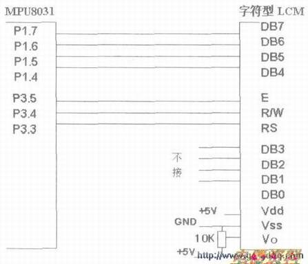 图2为4位数据总线方式的实用,它是利用HD44780所具有的4位数据总线的功能,简化电路接口的一种接口方式。