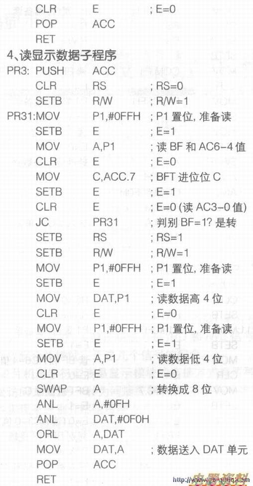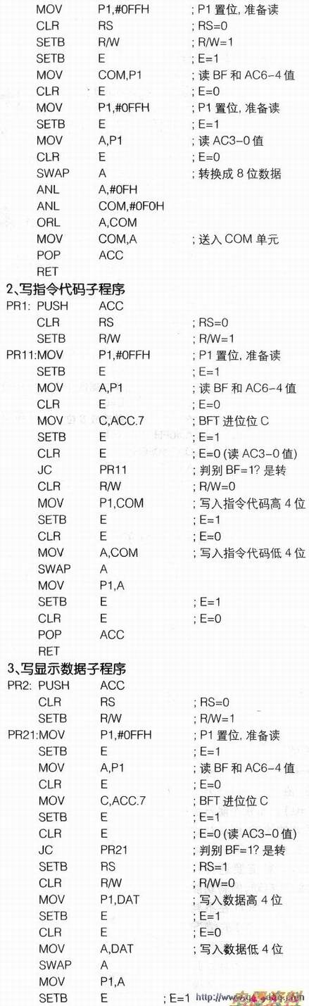 因为采用的是4位数据总线的方式,电路中只用到单片机P1口的高4位作为数据总线,而8031和显示模块内部的寄存器都是8位控制方式(即字节控制方式),所以编制程序时要注意硬件读进/送出的是高4位,而处理的数据都是一个8位的字节。