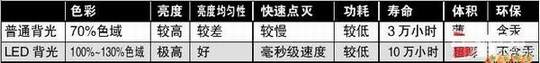 目前主流的CCFL(冷阴极背光灯)由于本身的频谱限制,发出的白色光线无法被分解为更多的彩色光线,色域范围只有NTSC 70%左右。而采用LED作为背光光源则有所不同,LED发出的光线覆盖的色谱范围更广,其色域范围可以达到100%-130%,而不会像传统CCFL背光一样出现30%的色彩损失。