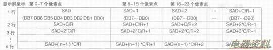 下图中存储器的字节存储单元存放的是屏上横向的8个点的显示状态,这样存储单元中的位与屏上的点横向一一对应。显示控制器中的显示存储区的首地址SAD寄存器中的内容对应于显示屏左上角的8个点,行字节数寄存器中的内容是分配给显示屏每行的显示字节单元数,它可以实际反映显示屏每行的实际像素点数/8,也可以根据编程需要比显示屏每行的实际像素点数/8大。这种数据格式通常用于中大规格的单色显示模块,对应的控制器包括T6963C、SED1335及兼容系列。另外还有一类控制器,例如HD61830的数据格式也是属于这种格式,不同的是数据与点的对应排位是从低位到高位,即屏上从左到右的点对应显示存储区的位是DBO到DB7。这类控制器还有一个特点是:除了通过对每一个像素进行编辑而实现整个显示屏的显示外,对于标准字符,还具有与点阵字符相同的代码显示方式以及自造字库的功能。