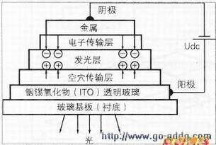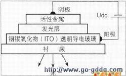其中,铟锡氧化物(ITO)透明导电玻璃作为器件的阳极,活性金属作为阴极,两个电极之间用有机发光材料作为发光层,厚度仅为数十纳米。当在两个电极之间加一个适当的时,电子和空穴分别从阴极和阳极注入,并且在发光层中相遇形成激子;使发光分子激发辐射出可见光。辐射光可从ITO的一侧观察到,金属电极膜同时也起到反射层的作用。