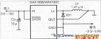 上图所示为采用MAXl836或MAXl837芯片产生负电压输出的Buck电路。该变换器在固定上工作,干扰较小。