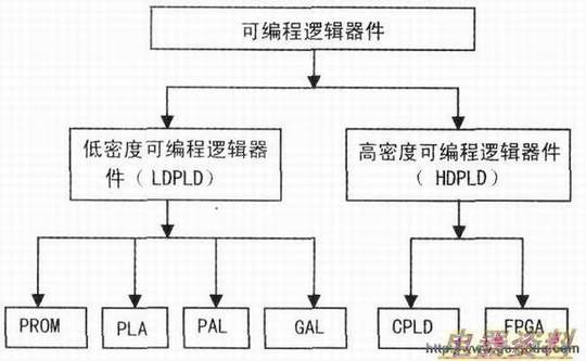 可编程逻辑器件PLD( Programmable Log Device)如果按集成度划分,可分为低密度可编程逻辑器件( LDPLD)和高密度可编程逻辑器件(HDPLD)。常见的低密度可编程逻辑器件有PROM、PLA、PAL及GAL等,通常简称为PLD器件。常见的高密度可编程逻辑器件有CPLD以及等。下图为按密度分类的可编程逻辑器件示意图。