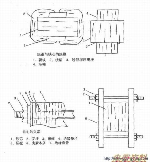 先用1mm厚的酚醛层压纸板做两块绝缘板,其宽度等于两根芯柱之间的距离(即铁芯窗口宽度),其长度大于芯柱叠厚3cm。先在下轭铁垫一块绝缘板,两边各伸出1.5cm,再把两个绕组分别套在两个芯柱上,用玻璃纤维板条把芯柱与绕组骨架之间的隙缝塞紧塞死,再在两个绕组上部垫好另一块绝缘板,装好上轭铁并用橡胶锤把上轭铁锤紧锤平齐,如上图所示。最后,对铁芯进行夹紧。夹紧铁芯有两种方法,一是用坚硬的木条两端穿过螺柱,再用两只螺帽夹紧。另一种方法是,如果铁芯四角有圆形通孔,可用长螺柱穿过通孔,两边再加压板用螺帽夹紧。采用这种方法要保证螺柱、压板和铁芯三者之间相绝缘,压板与铁芯之间要加绝缘板作绝缘层,螺帽与压板之间要加绝缘垫片,螺柱穿过铁芯时要加绝缘套管,套管要穿过两边压板的圆孔,两种夹紧方法见下图。