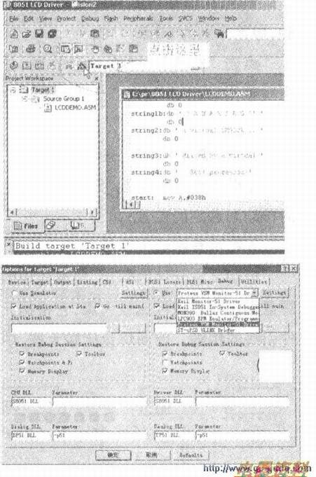第四步,keil的设置。为了让读者更好地了解这个过程,以Proteus自带的例子来说明。把“C:\ProgramFiles\Labcenter Electronics\Proteus 6ProfessionahSAMPLES”的“8051Driver"文件夹复制到新建的Proteus文件夹下。运行keil程序,在“8051LCDDriver"文件夹下建立一个新的名为8051 LCD Driver工程。单片机的型号选择AT89C52就可以,把LCDDEMO文件加到“Source Groupl”组里。点击工具栏的“option for target"按钮,如上图所示。在出现的对话框里点击“Debug”,在右栏上部的下拉菜单里选中“Proteus VSM Monitor-51 Driver”,还要点击一下Use前面的小圆点。设置好的情形如下图所示。