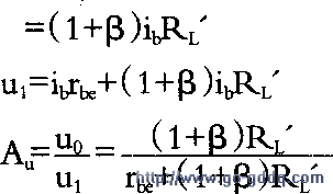 (1)较大倍数AuUo=(1+β)ib(Rb//RL)通常(1+β)Rl>>Rbe,故Au表达中分子约等于分母,即共集电极放大电路的Au约等于1。