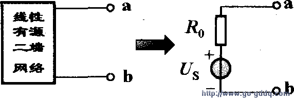 对外来说,任何一个线性有源二端网络,均可以用一个理想源和一个元件串联的有源支路来等效代替,其电压源Us等于线性有源二端网络的开路电压Uoc,元件的阻值R0等于线性有源二端网络除去后两个外引端子问的等效Rab,如图所示。